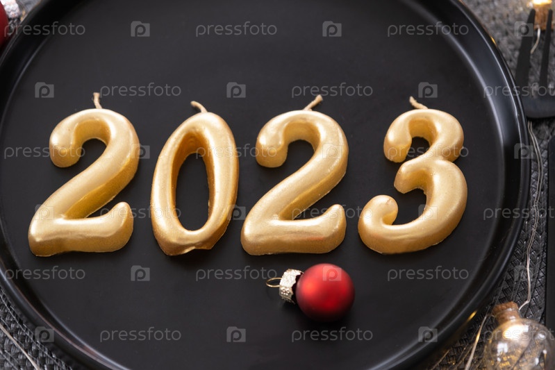 Золотые фигурки 2023 года из свечей на черной тарелке на праздничном столе с новогодней подачей. Интерьер в стиле лофт, вечеринка, застолье. Плетеная салфетка, вилка, нож