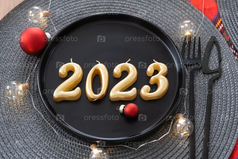 Золотые фигурки 2023 года из свечей на черной тарелке на праздничном столе с новогодней подачей. Интерьер в стиле лофт, вечеринка, застолье. Плетеная салфетка, вилка, нож