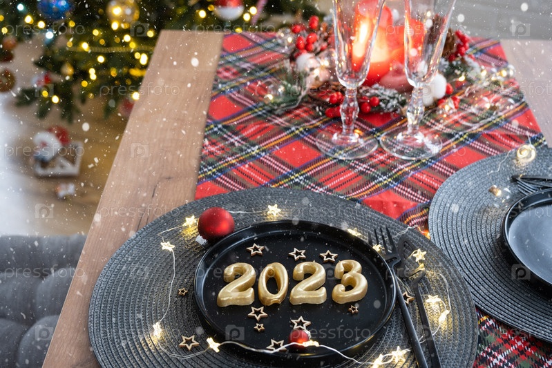Золотые фигурки 2023 года из свечей на черной тарелке на праздничном столе с новогодней подачей. Интерьер в стиле лофт, вечеринка, застолье. Плетеная салфетка, вилка, нож