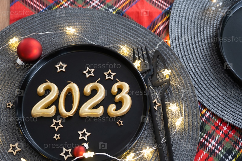 Золотые фигурки 2023 года из свечей на черной тарелке на праздничном столе с новогодней подачей. Интерьер в стиле лофт, вечеринка, застолье. Плетеная салфетка, вилка, нож