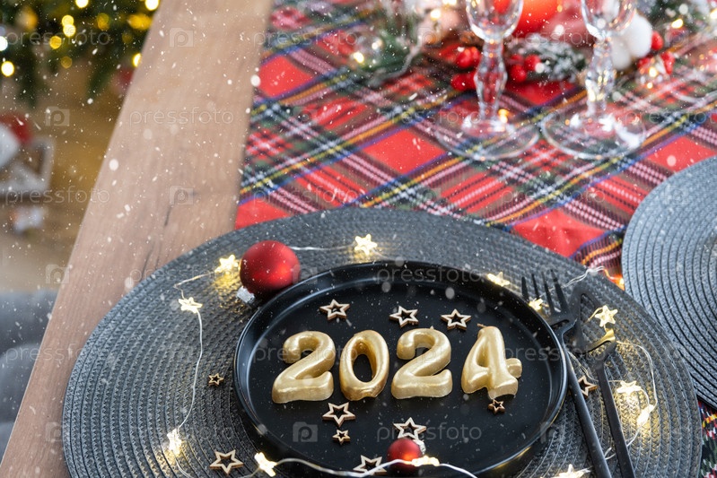 Золотые фигурки 2024 года из свечей на черной тарелке на праздничном столе с новогодней подачей. Интерьер в стиле лофт, вечеринка, застолье. Плетеная салфетка, вилка, нож