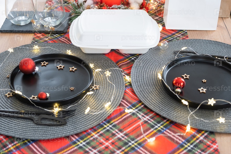Контейнеры службы доставки еды на столе, празднично поданные для празднования Рождества и Нового года. Посуда и декор в стиле лофт. Экономия времени, горячий заказ, одноразовая пластиковая коробка. макет