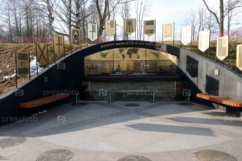 Парк «Остров фортов» в Кронштадте. Аллея героев Российского флота. Памятник. Россия, Кронштад, 29.03.2022