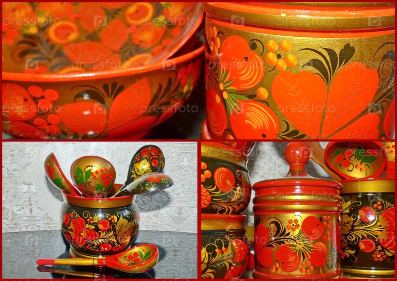 Фотоколлаж яркой хохломской деревянной посуды. Хохлома древний русский народный промысел XVII века. Традиционные элементы хохломы красные сочные ягоды репчики и земляники. Крупный план