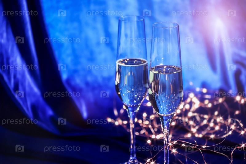 Бокалы шампанского и золотая гирлянда на синем бархатном фоне. Концепция рождественских и новогодних мероприятий. Праздничная открытка