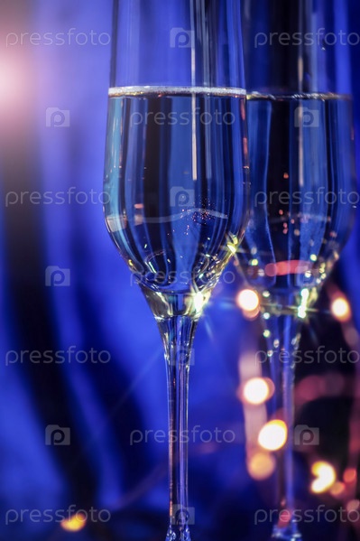 Бокалы шампанского и золотая гирлянда на синем бархатном фоне. Концепция рождественских и новогодних мероприятий. Праздничная открытка