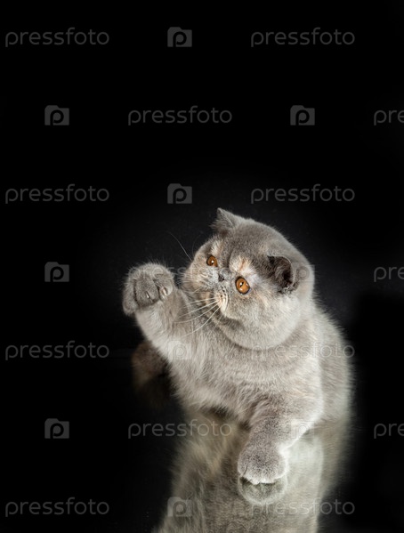 Красивая экзотическая короткошерстная кошка играет на темном студийном фоне с отражением. Окрас серый черепаховый