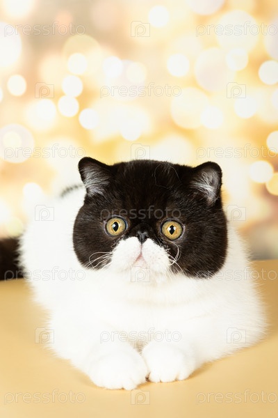 Красивая экзотическая короткошерстная кошка лежит на красочном праздничном фоне студии