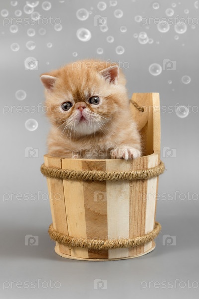Красный экзотический котенок сидит в большой деревянной чашке для ванны на сером фоне. Смешной