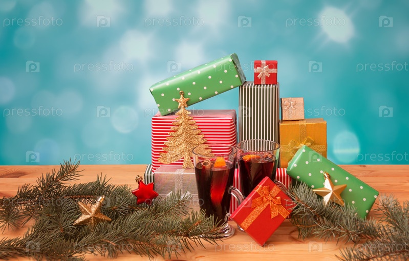 Бокалы глинтвейна, красочные подарки, рождественские украшения и еловые ветки на синем фоне. Выборочный фокус