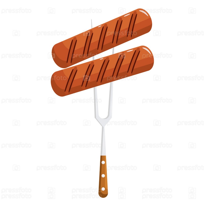 Две жареные сосиски на вилке на белом фоне
