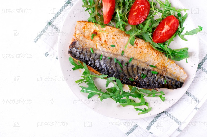 Жареная скумбрия подается с рукколой и помидорами. Рыбное блюдо. Вид сверху
