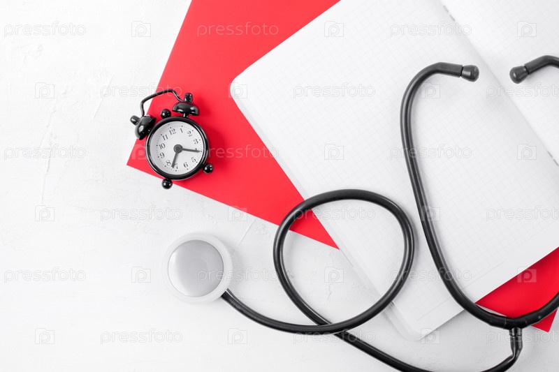 Медицинская плоская планировка. Будильник, стетоскоп, красная тетрадь и пустая страница на белом столе. Время для проверки