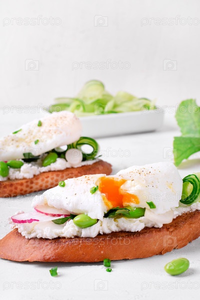 Яйцо-пашот на поджаренном хлебе со сливочным сыром, редисом, огурцом и бобами эдамаме на белом столе. Сэндвич на завтрак