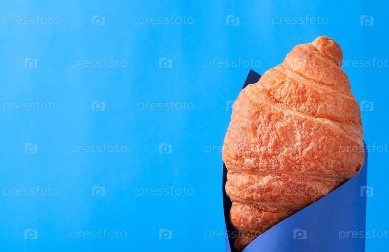 Свежий круассан на платформе с бумагой, вырезанной на синем фоне. Копировать пространство