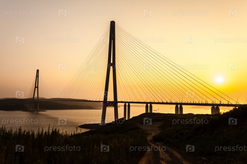 Вантовый мост "Русский мост" на остров Русский на закате. Владивосток, Приморский край, Россия