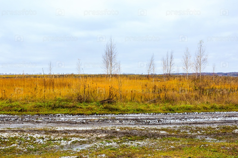 Пустынная грязная проселочная дорога осенью в пасмурную погоду
