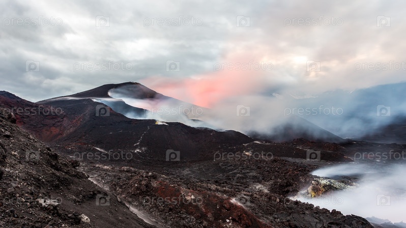 Извержение вулкана Толбачик на закате, полуостров Камчатка