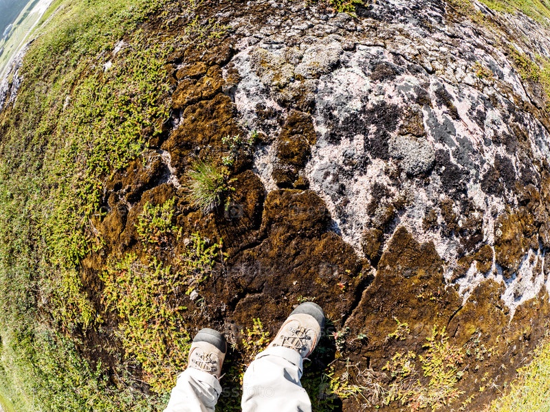 Ноги туриста в спортивной походной обуви гуляют по тундре. Концепция путешествий и приключений. Изображение объектива «рыбий глаз»