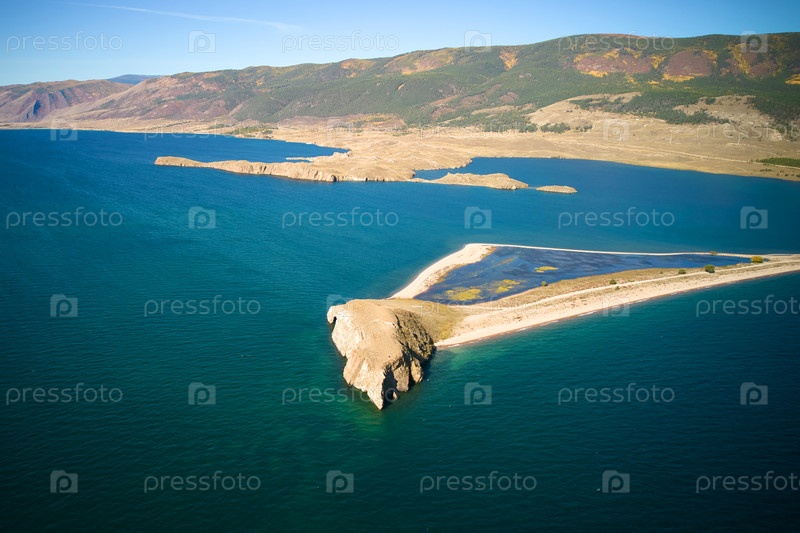Озеро Байкал с воздуха. Вид на залив у поселка Курма, мыс Уюга
