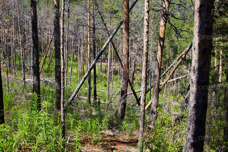 Сосновый лес в солнечный летний день. Упавшие сосны