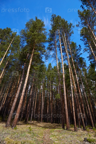 Сосновый лес в солнечный день. Вертикальная ориентация