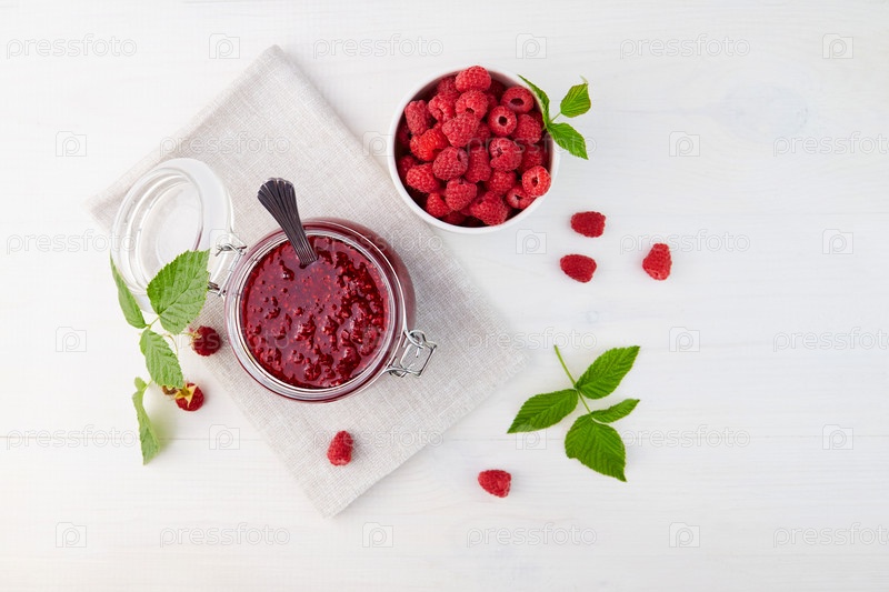Малиновое варенье в стеклянной банке и миску со свежими ягодами на фоне белого дерева. Консервация и летний урожай