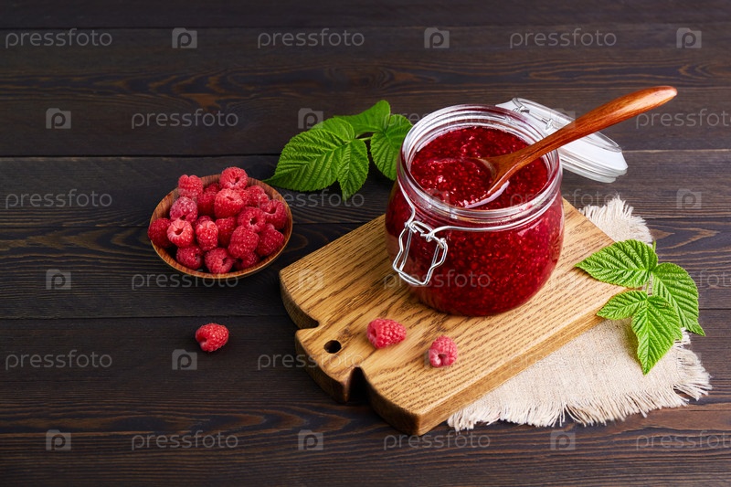 Малиновое варенье в стеклянной банке и миску со свежими ягодами на темном деревянном фоне. Консервация и летний урожай