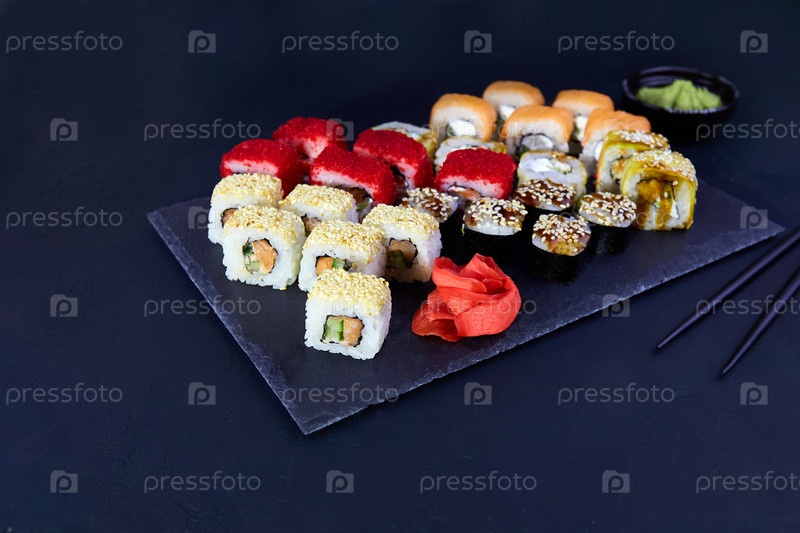 Ассорти из различных суши-роллов с тунцом, лососем, угрем, авокадо, икрой летучей рыбы, овощами. Большой набор суши