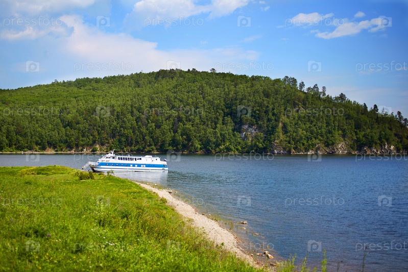 Летний круиз по озеру. Корабль с туристами стоит у берега. Вокруг лес, уединение, единение с природой