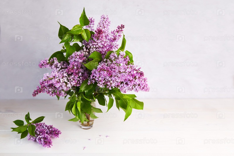 Букет сирени в вазе на сером фоне. Весенний фон. Сиреневые цветы