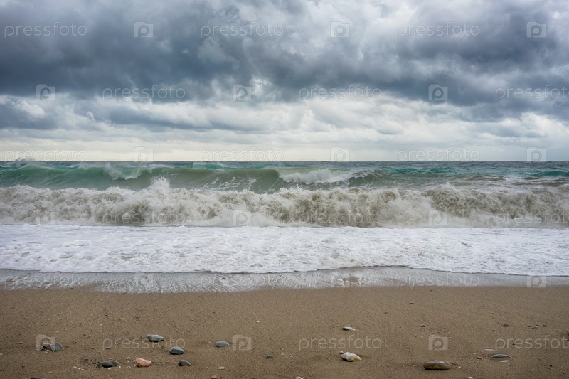 Ландшафт бурного моря под темными облаками и песчаным пляжем