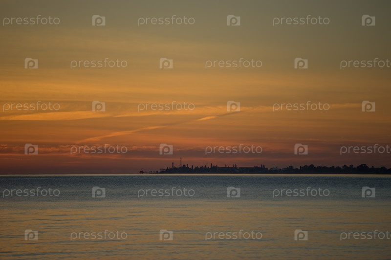 Морской пейзаж на закате с береговой линией города
