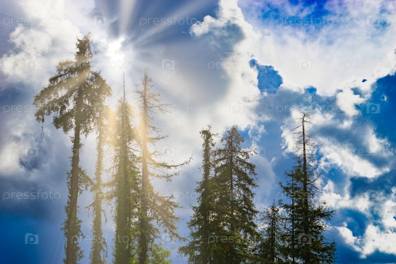 Силуэты высоких старых елей на фоне голубого неба с облаками