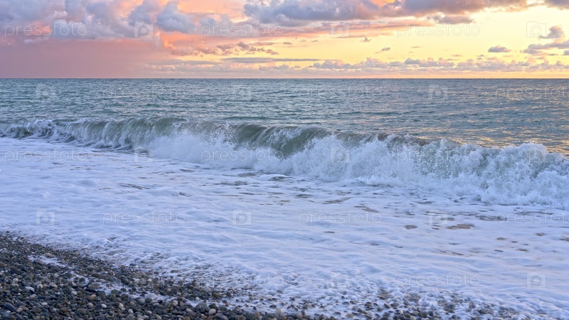 Морской пейзаж с волнами и розовым закатом