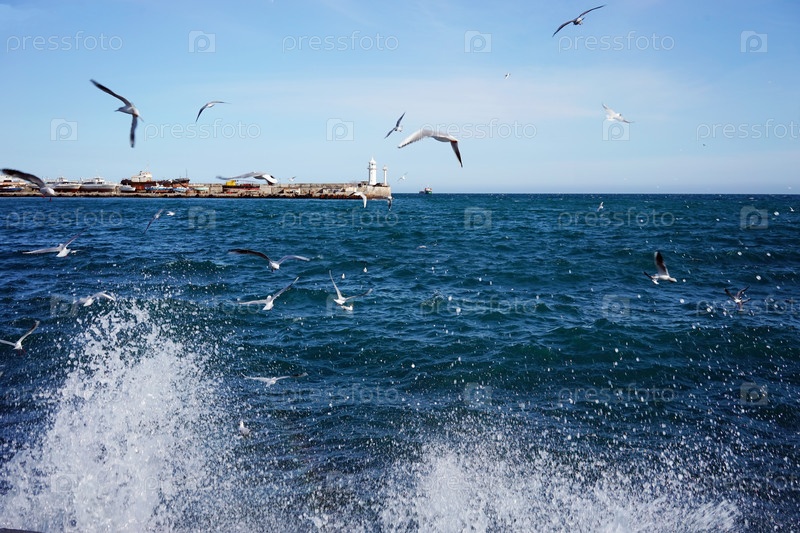 Морской пейзаж с видом на маяк и чаек