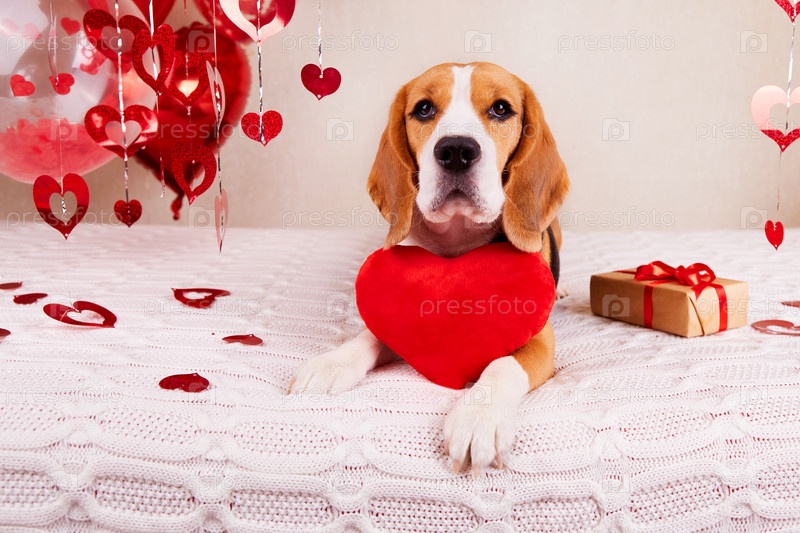 Собака-бигль на белом пледе с подушкой в виде красного сердца. Комната украшена воздушными шарами, подарок