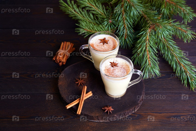 Традиционный рождественский напиток гоголь-моголь с яйцами, молоком, тертым мускатным орехом и корицей на темном деревянном фоне