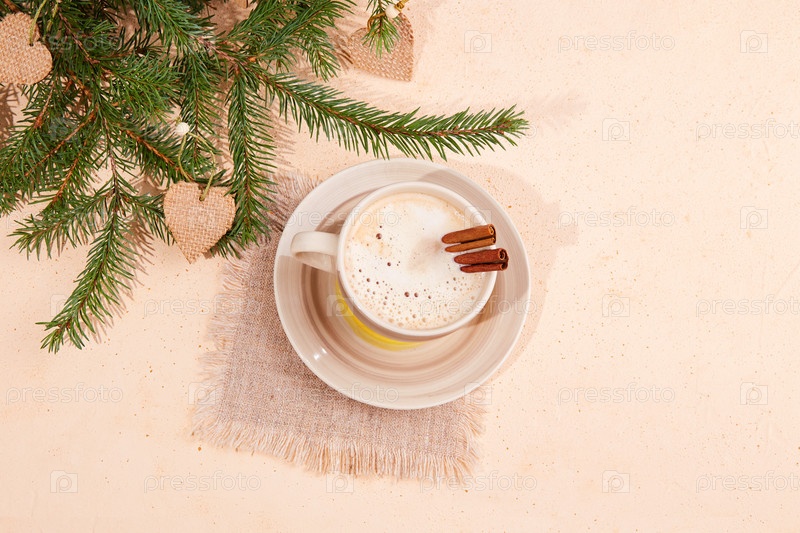 Рождественская композиция. Чашка кофе с палочками корицы, ветки елки