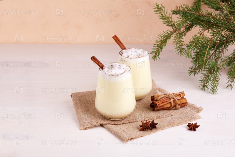 Рождественский напиток Eggnog с измельченным мускатным орехом, молоком, взбитыми яйцами, корицей