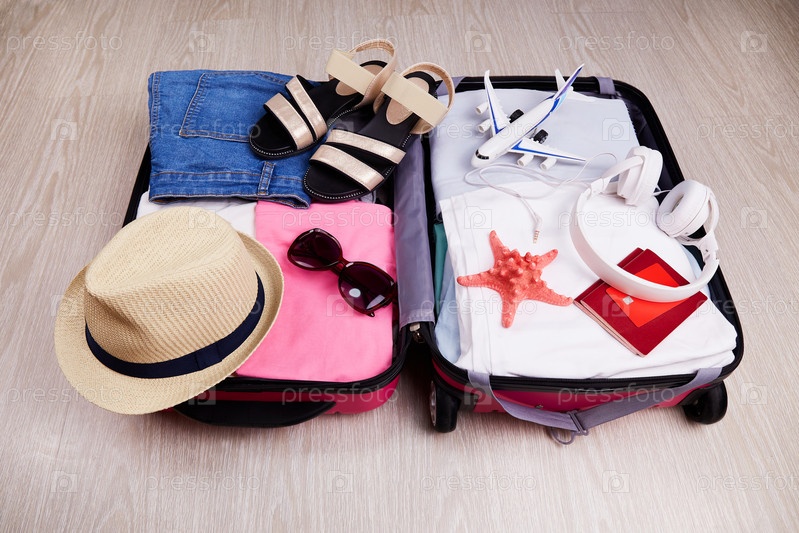 Открытый чемодан с летней одеждой, шляпой, сандалиями, солнцезащитными очками. Паспорт, карта, билеты на поездку