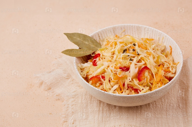 Нашинкованная капуста с морковью и перцем в миске на льняной салфетке. Маринованные овощи
