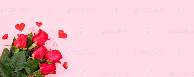 Букет красных роз, украшения в форме сердца на розовом фоне. Веб-баннер