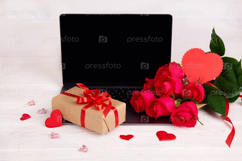 Покупки онлайн. Экран ноутбука, букет красных роз, подарочная коробка, украшения в форме сердца
