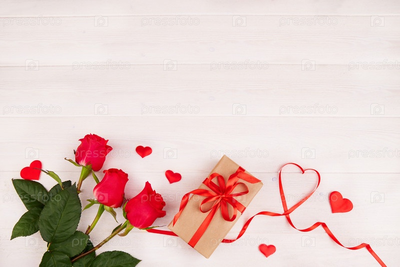 Букет красных роз, коробка в крафт-пакете с красной лентой и лентой в форме сердца