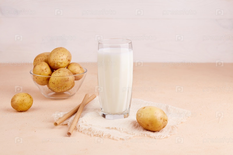 Веганское картофельное молоко в стакане, клубни картофеля в миске. Заменитель молока на растительной основе. Не содержит лактозы