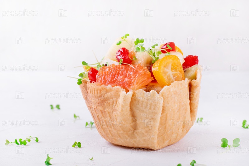 Фруктовый салат в вафельном стаканчике на белом. Грейпфрут, банан, кумкват, груша, яблоко, киви, сушеная вишня и микрозелень смешаны и подаются. Детское питание