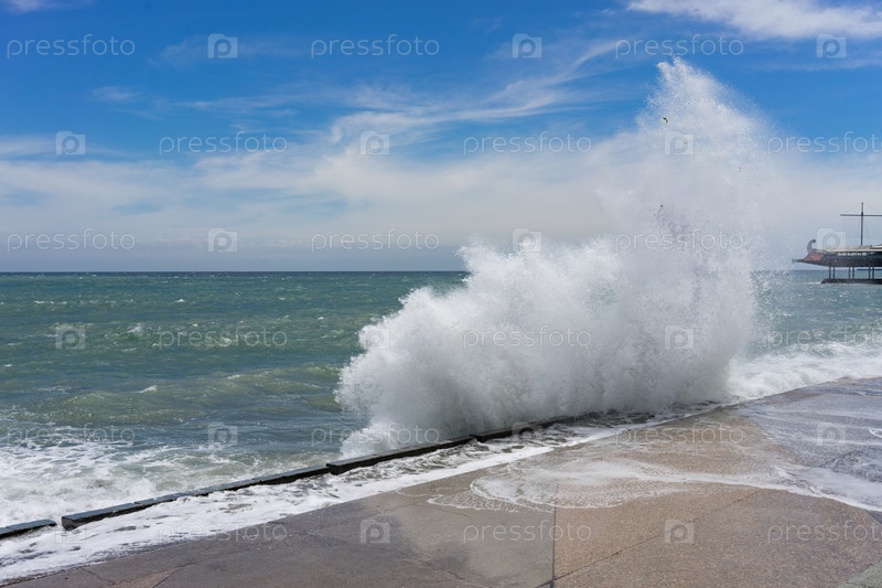Морской пейзаж с высокими волнами на фоне береговой линии Ялты