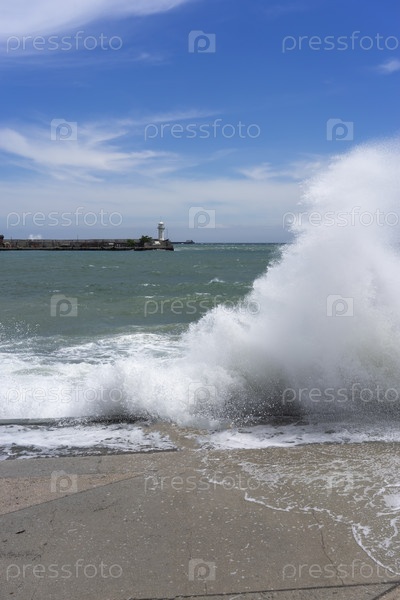 Морской пейзаж с волнами и видом на маяк. Ялта, Крым