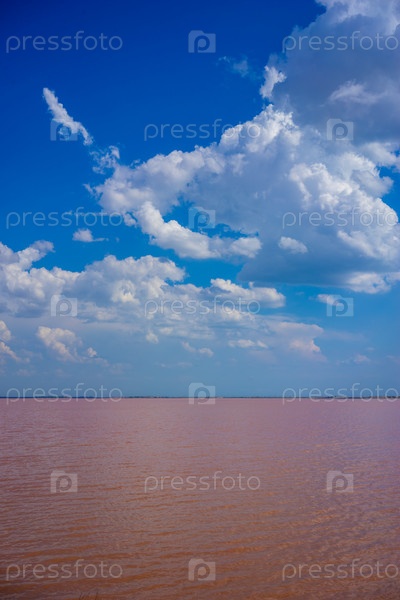 Пейзаж с видом на розовое соленое озеро под голубым небом с облаками